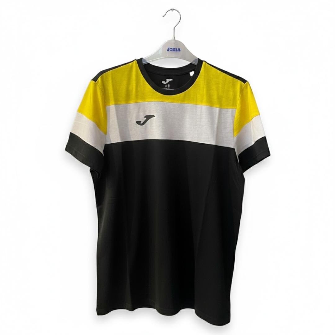 - Diseño tricolor: con panelas horizontales en amarillo vibrante, blanco y negro solido regular con cuello redondo reforzado para mayor comodidad y resistencia.