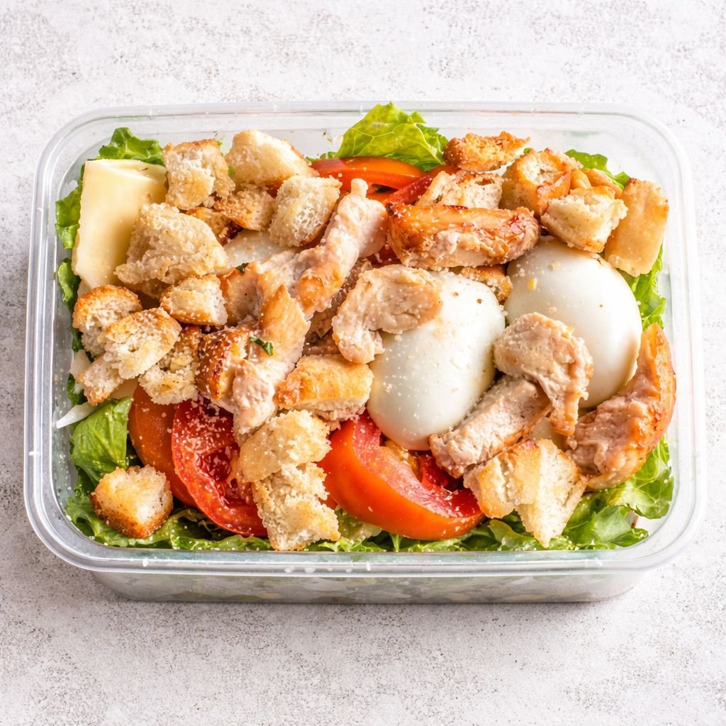 Lechuga, crotones de pan, pechuga de pollo y queso.