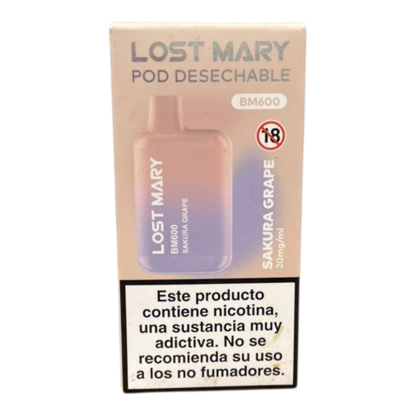 Este kit de vapeo Lost Mary BM600 incluye el sabor Uva Sakura en una cápsula precargada. El kit contiene una cápsula con 2 ml de e-líquido con una concentración de sales de nicotina del 2,0%, diseñada para ofrecer hasta 600 inhalaciones. Las cápsulas utilizan una resistencia Mesh de 1,2 ohm. La batería recargable de 360 ​​mAh incluida es compatible con estas cápsulas precargadas y se recarga mediante USB-C. Este dispositivo está diseñado para vapeo MTL (boca a pulmón) y se activa al inhalar. La batería del kit Lost Mary BM600 es recargable y reutilizable con cápsulas precargadas de sabores originales de Lost Mary.